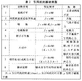 從振動診斷的角度來看,①引風(fēng)機(jī)是一種旋轉(zhuǎn)機(jī)械因而有不平衡、不對中之類的故障,②引風(fēng)機(jī)是一種流體機(jī)械,有旋轉(zhuǎn)失速、喘振的可能性存在,③引風(fēng)機(jī)受工作環(huán)境的影響,經(jīng)常造成葉片的磨損,介質(zhì)還可能粘附在轉(zhuǎn)子上形成隨機(jī)性變化的不平衡,④引風(fēng)機(jī)由電機(jī)驅(qū)動,可能存在電磁振動。為此,引風(fēng)機(jī)的振動可歸結(jié)為8種類型,見表2。