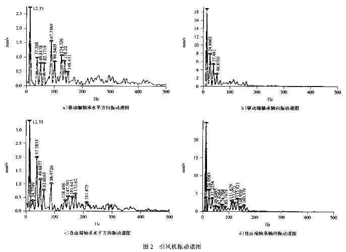 該引風(fēng)機(jī)不平衡振動最明顯的特征,一是徑向振動大,二是諧波能量集中于基頻(12.33Hz),而該引風(fēng)機(jī)的徑向振動均在30μm以下;在圖2所示的徑向頻譜中,基頻振動最大只有3.35mm/s。因此,引風(fēng)機(jī)的振動并非由不平衡引起。